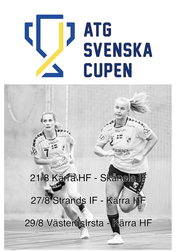 ATG Svenska Cupen närmar sig med stormsteg. Vi har nästa vecka tre matcher hemma. Herrarna tar emot Lugi HF på onsdag kl 19:30, sedan är det dubbelarrangemang på lördag med herrarna först mot HK Ankaret kl 14:00 och damerna mot Skånela IF kl 16:30. Just nu får vi ta 100 åskådare och biljetterna kostar 80:- (gäller även dubbelarrangemanget). Köpta biljetter går att förboka med sms till Thomas på 0707-462263. Uppge namn, antal och vilket arrangemang det gäller. Överblivna biljetter är det först till kvarn på under matchdagen. Missa inte att se Kärra HF spela ATG Svenska Cupen!