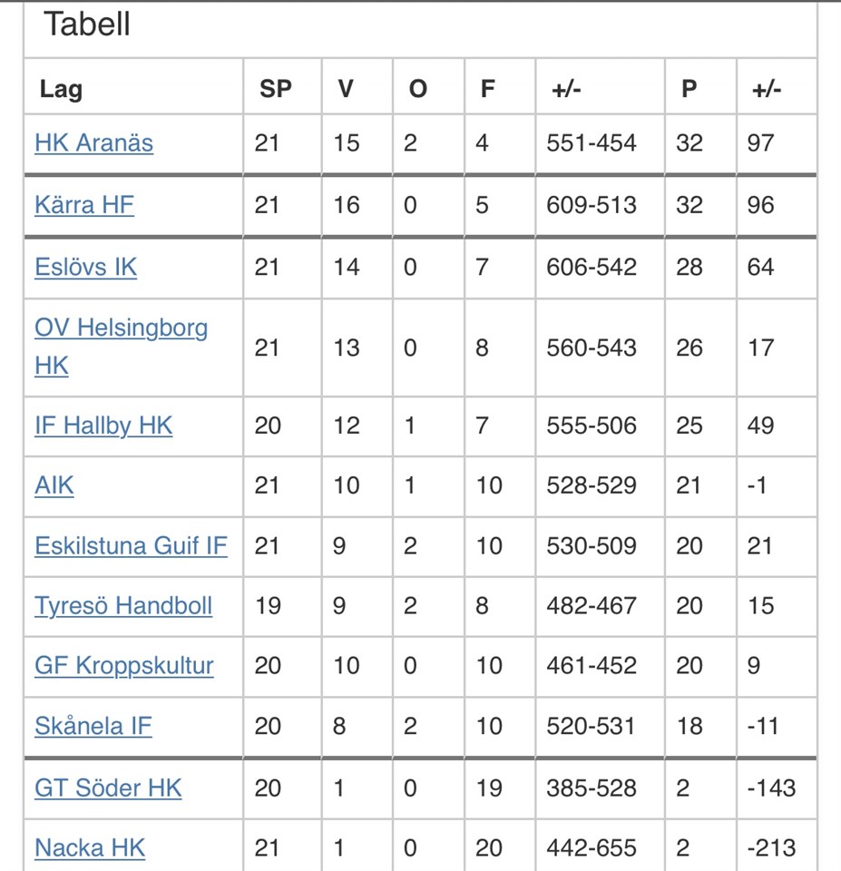 28/3 kl.16.00: Damallsvenskan GF Kroppskultur - Kärra HF Matcherna ( fortfarande utan publik) följs med fördel via https://solidsport.com/karrahf-damer Livescore Som tidigare rapporterats så är det efter 21 omgångar superjämnt mellan ettan Aranäs och tvåan Kärra inför sista omgången. Samma poäng och ett mer plusmål för Aranäs som möter Tyresö hemma i sista omgången. Vid lika poäng gäller målskillnad, vid lika målskillnad gäller mest gjorda mål i serien. Läs intervjun med klubbchef Magnus Björklund i Backa/Kärra tidning (sid 22) inför matchen. Ettan går alltså upp till SHE, medan tvåan får kvala i bäst av 5 matcher mot Skövde HF.