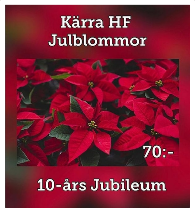 Hej, Då var det dags att sälja dom årliga julstjärnorna :) Tjejerna fick med sig hem lappar att fylla i till försäljningen. Julstjärnorna är av toppkvalité och finns även i år som röda eller vita. Priset är 70:-/st. Ersättning per blomma är 7:- till spelarkontot. Skicka din beställning tillsammans med spelarnamn och antal röda respektive vita blommor senast 23 november till karrahf.f2012@gmail.com eller Peters mobil 0707-277100 Ni kommer kunna hämta blommorna onsdagen 29 november i Lillekärrshallen på eftm/kvällen.