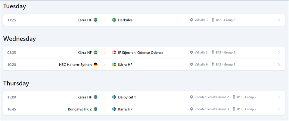 Hej, 4-8 juli spelar vi Partille Cup, nedan följer lagindelning och tider för gruppspelet. Ladda ner appen, Partille Cup, för mer info om planer och resultat. Efter junicupen där vi fick känna på alla typer av väder ber vi er att kolla väderleksrapporten och förbereda kläder efter väder. Ta med matchtröja, shorts, skor, vattenflaska och boll. Vi spelar på konstgräs, så vanliga inomhusskor blir bäst. Skicka med något mellanmål till tjejerna då man blir hungrig av att spela och titta på handboll! Hör av er till respektive ledare eller andra föräldrar i laget om ni behöver hjälp med skjuts. Kärra HF 1 (Jocke) - Tisdag samling Valhalla, plan 5, 14:30 Tisdag: 15:15 Onsdag: 14:25, 16:10 Torsdag: 13:50, 15:35 Lea F Eliza Erela Agnes Isabelle Y Tindra Elsa Thea Rachel Kärra HF 2 (Frida & Thereze) - Tisdag samling Kviberg Serneke Arena, plan 5, 14:10 Tisdag 14:55, 16:40 Onsdag: 08:35, 10,20 Torsdag: 14:25, 16:10 (spelar på Valhalla på torsdagen) Melina Melissa A Sara Alice Svea Ella Helin Leah G Leia Kärra HF 3 (Sarah) - Tisdag samling Valhalla, plan 5, 9:00 Tisdag: 09:40, 11:25 Onsdag: 10:20, 12:05 Torsdag: 08:35, 10:20 Iris Frida Alina Maja Isabelle B Wilma Alva K Izabelle I Cornelia